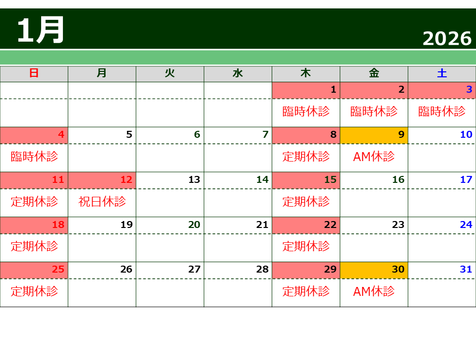 また、2日(金)、3日(土)は臨時休診のため、5日(月)より平常通り行います。